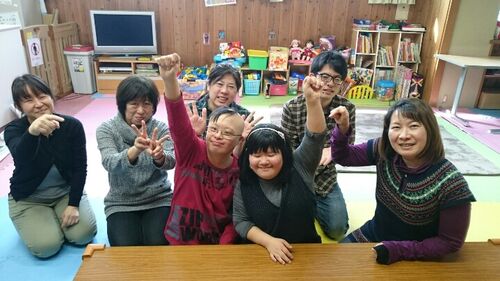 すまいるの利用者さん、 今日が卒業式でした〓 スタッフにかこまれて笑顔でポーズ スタッフのコメント 「感無量です」 「おめでとうしかありません、中学校でも頑張ってね」